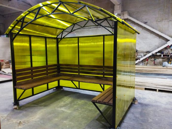Арочная, покатая. Профильная труба 40х20х3 мм. Сотовый поликарбонат, толщиной 10 мм, цвет желтый. |